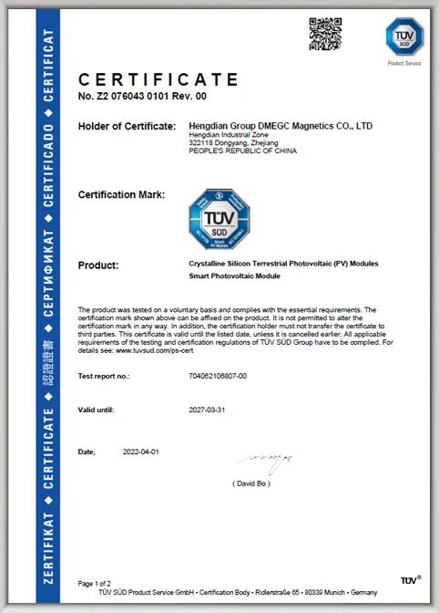 近日,橫店東磁新一代“智能組件”順利通過IEC61730及IEC62109-3測試,獲得TüV南德意志集團(以下簡稱“TüV 南德”)頒發的全球首張“智能組件”認證證書。